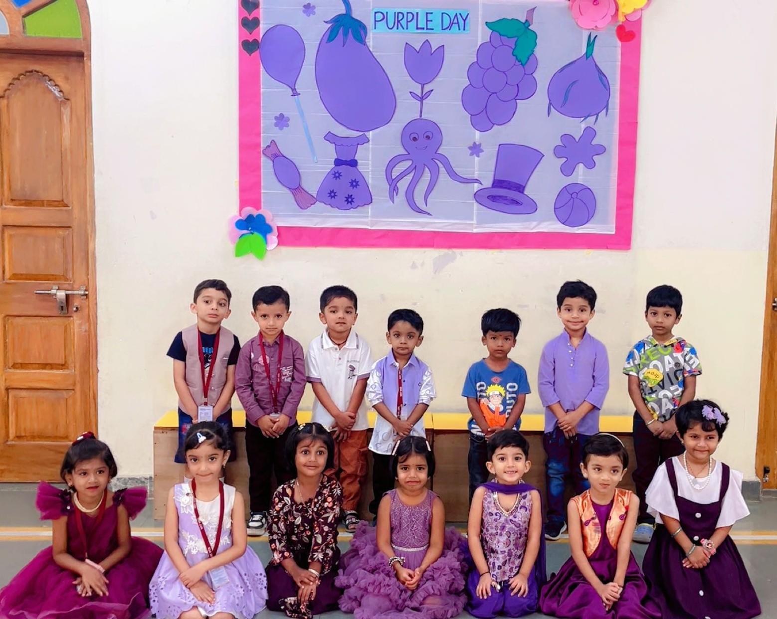 The event transformed classrooms into vibrant spaces decorated with purple balloons, ribbons, and cut-outs of familiar objects like grapes, brinjals, and lavender flowers. Students and teachers dressed in different shades of purple, adding to the festive atmosphere.
